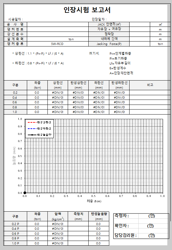 + 추가로 현장에서 많이 안하는 부분은 어스앵커의 인장 및 인발 시험을 실시 하지 않은 앵커체는 반드시 확인시험(늘음량)과 천공기록부를 비치해야합니다.