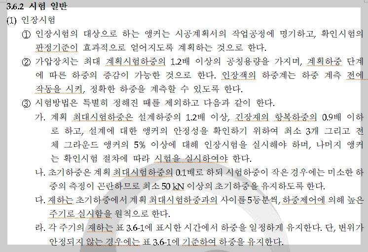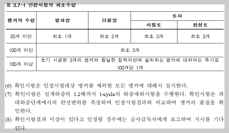 → 정착장의 지질에 따라 최소 갯수가 정해지며 최소3개이상 실시한다 또한 시험을 실시한거 이외의 앵커체는 확인시험을 실시한다.